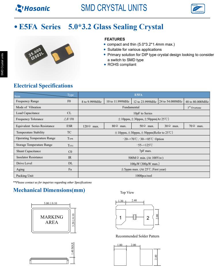 E5FA54.0000F19MYZE|54.000M|19PF晶振|HOSONIC CRYSTAL|HOSONIC晶振