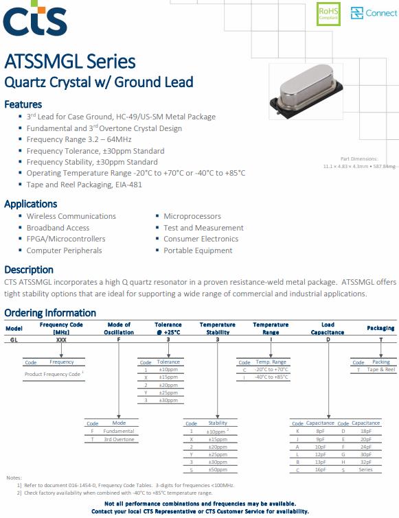 西迪斯晶振ATSSMGL,GL270F23CDT無源石英晶體 CTS ATSSMGL在經過驗證的電阻焊接金屬封裝中集成了高Q石英晶體諧振器。ATSSMGL提供緊密的穩定性選擇,是支持廣泛的商業和工業應用的理想選擇。