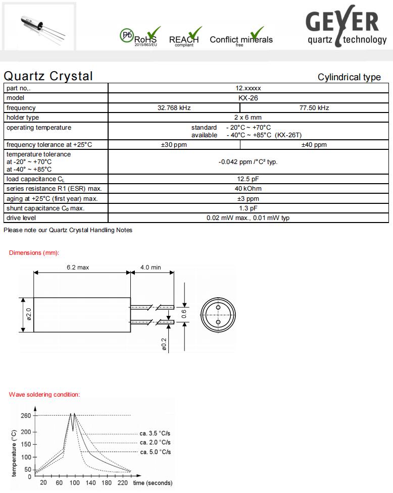 12.80116|32.768KHz|12.5pF|GEYER晶振,GEYER晶振,KX-26無源晶振,圓柱晶振,12.80116晶振,進(jìn)口石英晶振,晶體諧振器,二腳插件晶振,2.0*6.0mm晶振,頻率32.768KHz,負(fù)載12.5pF,頻率容差20ppm,工作溫度-20~70°C,高可靠性晶振,高質(zhì)量晶振,小體積晶振,兒童學(xué)習(xí)產(chǎn)品晶振,智能手表晶振,平板電腦晶振,DVD家電影音系統(tǒng)晶振.