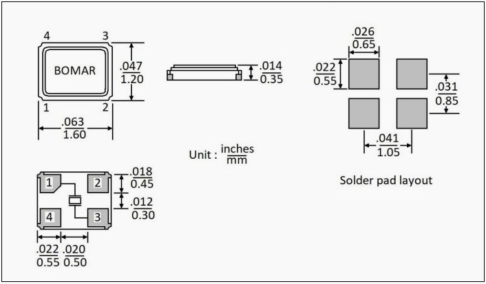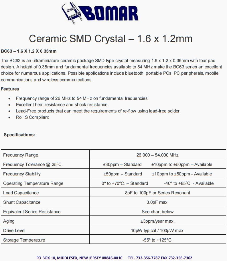 Bomar晶振,BC63進口晶振,6G接收器晶振,美國Bomar晶振公司,BC63是一款尺寸為1.6 x 1.2 x 0.35mm的超微型陶瓷封裝SMD型晶體,采用四焊片設計。0.35mm的高度和54 MHz的基頻使BC63系列成為眾多應用的絕佳選擇。可能的應用包括藍牙、便攜式個人電腦、個人電腦外圍設備、移動通信和無線通信,高品質晶振6G發射器晶振,6G通訊設備晶振,高精度儀器晶振,6G以太網晶振,無源晶振,SMD封裝,5032晶振,四腳晶振,貼片晶振,石英晶振
