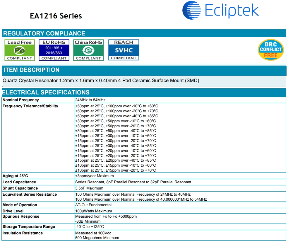 EA1216MA08-25.000M TR|EA1216晶振|無源晶振,物料編碼EA1216MA08-25.000M,型號EA1216,頻率25MHZ,精度±20ppm,負載電容8PF, 尺寸: 1.6*1.2*0.4mm,溫度范圍:-40℃-85℃,SMD晶振,歐美進口晶振,無源晶振,石英晶振,ECLIPTEK晶振,晶振廠家,石英晶體諧振器,應用于錄音筆,微型攝像頭,智能手機,網卡,衛星電話,ETC機器.