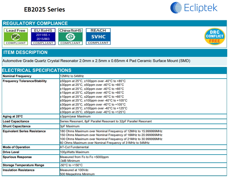 EB2025YA10-25.000M TR|EB2025晶振|貼片晶振,物料編碼EB2025YA10-25.000M TR,型號(hào)EB2025,頻率25MHZ,精度±50ppm,負(fù)載電容10PF, 尺寸: 2.5*2.0*0.5mm,溫度范圍:-40℃-125℃,四腳晶振,晶振,無源晶振,石英晶振,ECLIPTEK晶振,晶振廠家,石英晶體諧振器,應(yīng)用于數(shù)碼游戲機(jī),相機(jī),無線對(duì)講機(jī),麥克風(fēng),藍(lán)牙音響,飛行器.