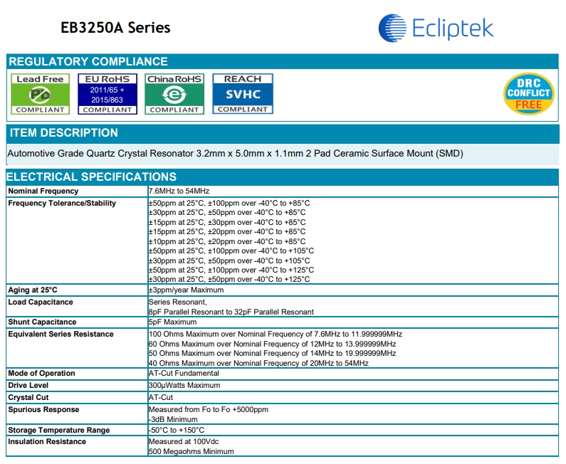 EB3250AYA08-25.000M TR|EB3250A|5032晶振,物料編碼EB3250AYA08-25.000M TR,型號(hào)EB3250A,頻率25MHZ,精度±50ppm,負(fù)載電容8PF, 尺寸:5.0*3.2.1.2mm,溫度范圍:-40℃-125℃,SMD晶振,晶振,無(wú)源晶振,石英晶振,ECLIPTEK晶振,晶振廠家,石英晶體諧振器,應(yīng)用于洗衣機(jī),空調(diào),遙控器,微波爐,熱水器,電飯煲,電磁爐.