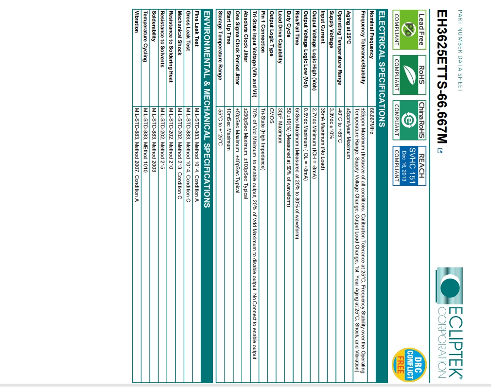 EH3625ETTS-66.667M|±25ppm|晶振,物料編碼EH3625ETTS-66.667M,頻率66.667MHZ,精度±25ppm,負載電容30PF, 輸出LVCMOS 60%,尺寸: 4-Pin CSMD Bulk,溫度范圍:-40℃-85℃,電壓3.3V,SMD晶振,有源晶振,SPXO晶振,差分晶振,歐美晶振,晶振,石英晶體振蕩器,ECLIPTEK晶振,特點:輕型,薄型,小型,低抖動,低功耗,低差損,應用于磁共振,CT,X光,腦電圖,紅綠燈,攝像頭,投影儀等.