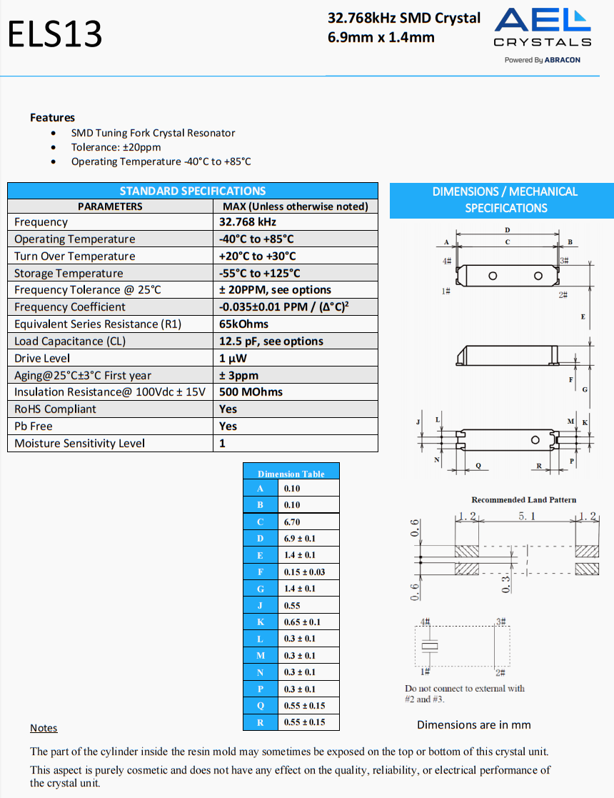 | ELS13-32.768kHz-T | AEL晶振 | ELS13 | 32.768 kHz | 0 | ±20ppm | 12.5 pF |