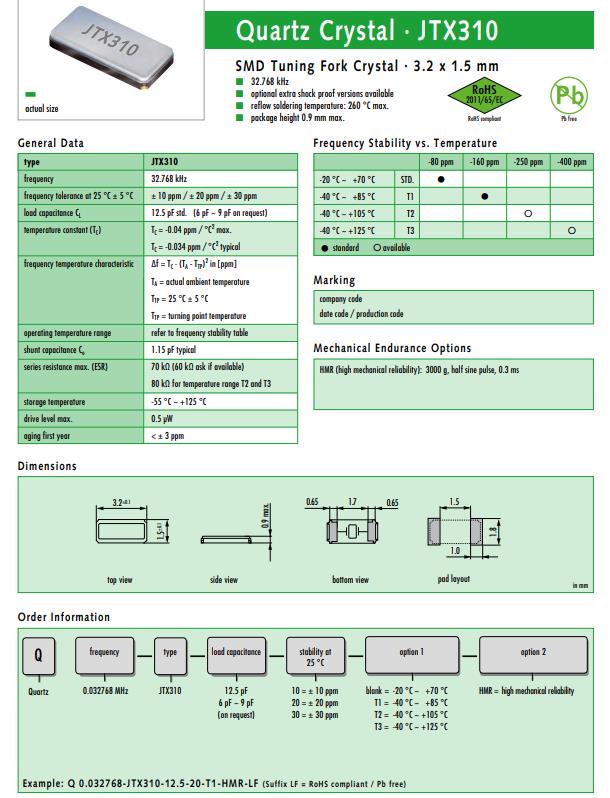 | Q 0.032768-JTX310-7-20-T2-HMR-LF | Jauch晶振 | JTX310 | 32.768kHz | ±20ppm | 7pF | -40°C ~ 105°C |