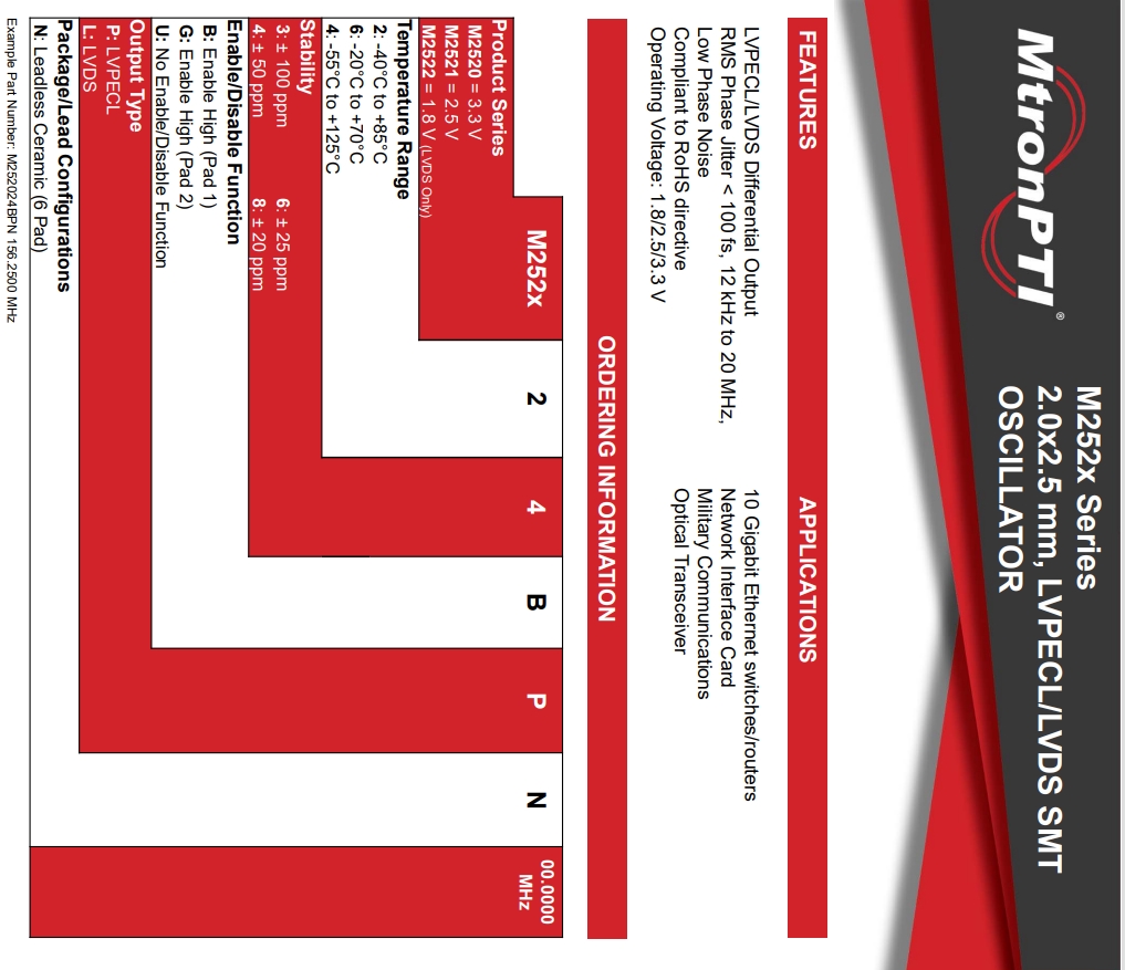 M2520S07 156.250000|M252x|±20 ppm|MTRONPTI晶振 ,歐美進口晶振,MTRONPTI晶振, 型號M250x ,編碼M2502S07 156.250000 ,精度±20PPM,頻率156.25MHZ,電壓3.3V,輸出HCMOS,尺寸2520mm.2520石英晶體振蕩器,2520有源晶振,2520mm晶振,SPXO晶振,工作溫度范圍:-40°C-85°C,四腳貼片,特點:高精度,高品質(zhì),高性能,高溫度,低電壓.應(yīng)用于CT掃描,B超,溫度計,磁共振,激光治療機,心電機圖,腦電圖機,肌電圖機,X光機等.