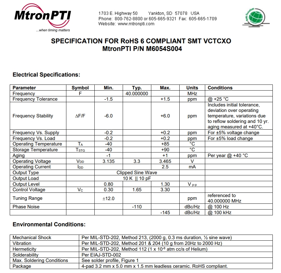 | M6054S004 40.000000 | M6053 and M6054 | ±6 ppm | 40 | 3.2 X 5.0 mm | -40°C - +85°C | 3.3 |