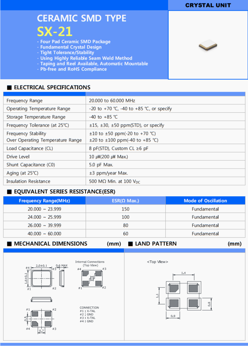 | 老化 | ±3 ppm/year Max. |