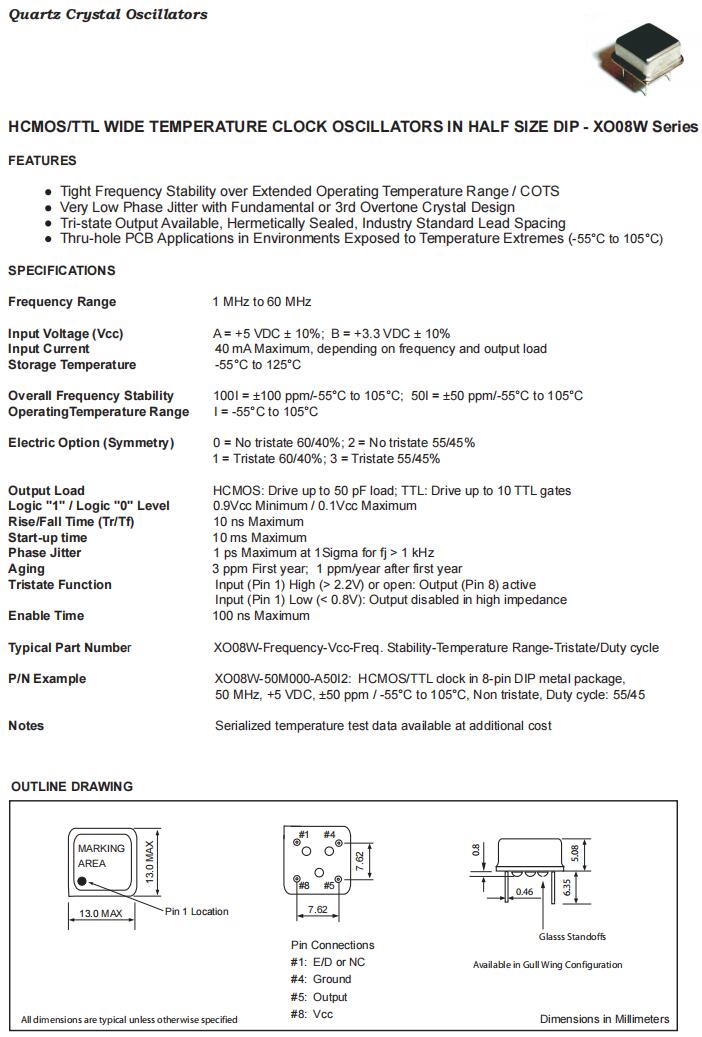 XO08W-50M000-A50I2|50MHz|5V|Fortiming正方形鐘振,Fortiming晶振,XO08W有源晶振,正方形鐘振,XO08W-50M000-A50I2晶振,石英晶體振蕩器,四腳插件晶振,頻率50MHz,電壓5V,頻率容差50ppm,工作溫度-55~105°C,在擴展的工作溫度范圍/ COTS上具有緊密的頻率穩(wěn)定性,低相位抖動晶振,通孔PCB應(yīng)用晶振,網(wǎng)絡(luò)附屬存儲晶振,固態(tài) 硬盤晶振,通用處理器晶振.