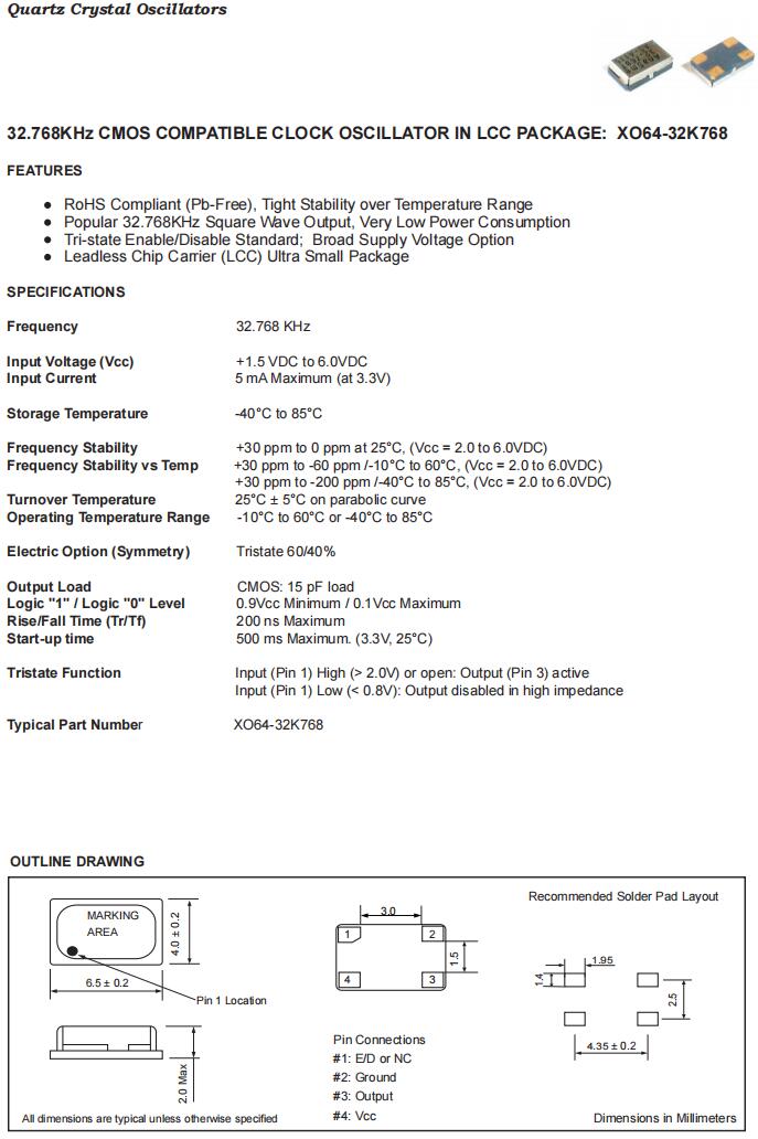 XO64-32K768-B30B3|32.768KHz|3.3V|富通時鐘振蕩器,富通晶振,XO64-32K768時鐘振蕩器,有源晶振,XO64-32K768-B30B3晶振,石英晶體,6.5×4.0mm晶振,四腳貼片晶振,SMD晶體,頻率32.768KHz,電壓3.3V,頻率穩(wěn)定性30ppm,工作溫度-40~85°C,低功耗晶振,高穩(wěn)定性晶振,高品質(zhì)晶振,微處理器時鐘晶振,COTS網(wǎng)絡(luò)設(shè)備晶振,以太網(wǎng)晶振,數(shù)據(jù)中心晶振.