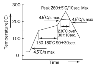 | 8 | 焊料耐熱性試驗(yàn) | 回流三次,180±10°C 90±30秒,峰值溫度260±5°C(最長10秒),(230°C至30±10秒) | * 1 |