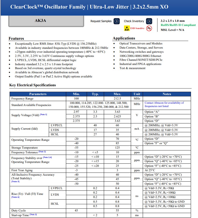超低抖動clear clock SMD振蕩器AK3ADAQ1-120.000T3,AK3A振蕩器小體積晶振尺寸3.2x2.5mm的行業(yè)標準尺寸,有源晶振,提供節(jié)省空間的設(shè)計,與以前的型號相比,抖動性能大幅提高。這些振蕩器還支持各種差分輸出,因此可以輕松集成到各種系統(tǒng)中。第三泛音ClearClock技術(shù)減少了基于鎖相環(huán)(PLL)的乘法運算,消除了降低整體功耗的可能性。使這些新的ClearClock振蕩器非常適合光收發(fā)器、數(shù)據(jù)中心、存儲和服務(wù)器、網(wǎng)絡(luò)交換機和網(wǎng)關(guān)、100G/200G/400G/800G以太網(wǎng)、光纖通道和PCIe終端應(yīng)用。