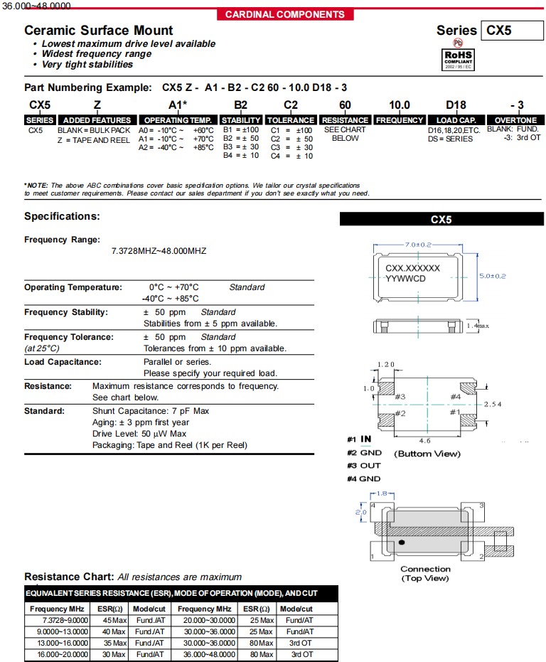 美國Cardinal卡迪納爾晶振CX5系列,小體積晶振尺寸7.0x5.0x1.4mm四腳貼片晶振,無源晶振,石英晶體諧振器,無鉛環保晶振,頻率范圍:7.3728MHz至48MHz,工作溫度范圍:-40℃至+85℃,微型薄型表面貼裝石英晶體,封裝是自動化表面貼裝的理想選擇組裝和回流實踐。 帶卷包裝。 AT切割水晶,具有超小型,輕薄型,耐熱及耐環境特點,該貼片晶振用于:WiFi、藍牙、無線局域網、物聯網、可穿戴設備、Zigbee、微處理器時鐘應用晶振CX5Z-A5B2C5-40-12.0D18