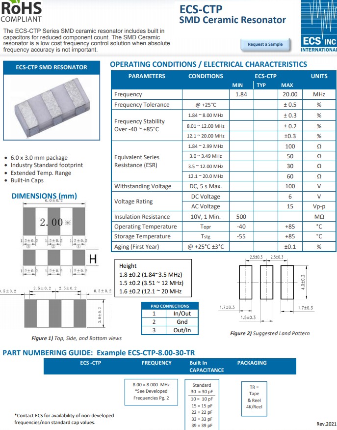 ECS晶振ECS-CTP系列陶瓷諧振器是絕對頻率精度不太重要的低成本應用的理想選擇。小體積晶振采用6.0x3.0mm封裝三腳貼片晶振。封裝高度取決于頻率。這些諧振器非常適合絕對頻率精度不太重要的低成本應用。在+25°C時,頻率容差為0.5%,在1.84MHz至8MHz溫度范圍內的穩定性為0.3%,在8.01MHz至12MHz溫度范圍內的穩定性為0.2%。內置電容值選項有10pF,15pF,22pF,30pF,33pF和39pF。ECS-CTP-8.00-30-TR陶瓷諧振器是低成本應用的理想選擇