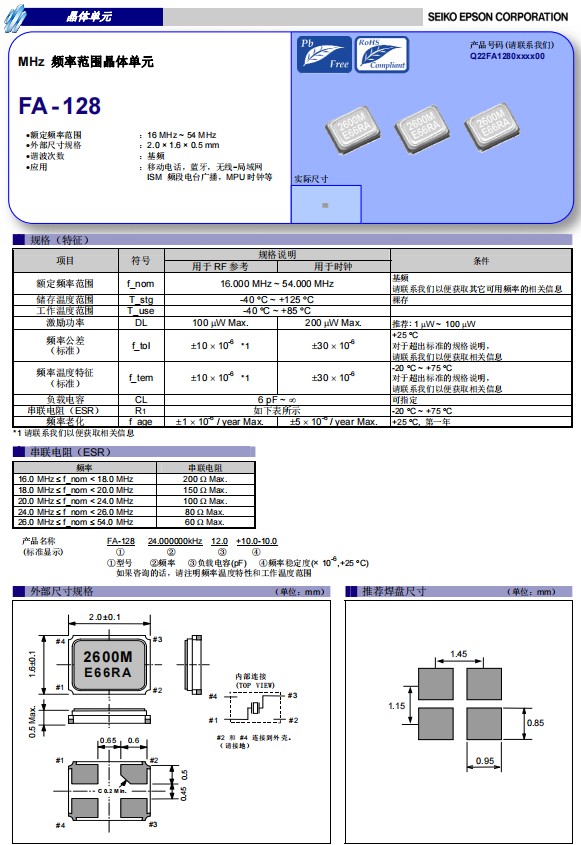 愛普生晶振FA-128是一款小體積晶振尺寸2.0x1.6mm無源晶振,石英晶體諧振器,四腳貼片晶振,頻率范圍:16MHz至54MHz,具有超小型,輕薄型,穩定性好,耐熱及耐環境特點,該款FA-128小體積晶振,可以在-40℃至+85℃(+105℃)的溫度內穩定工作,被廣泛應用于小型便捷式通信設備、手機、筆記本、數碼相機、平板電腦電表、水表、計量儀表、汽車電子、工業控制系統等。