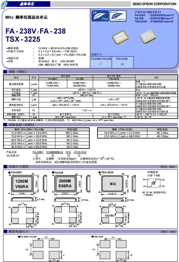 日本愛普生晶振FA-238是一款小體積晶振尺寸3.2x2.5mm石英晶體諧振器,無源晶振,四腳貼片晶振,頻率范圍12MHz至60MHz,可在在-40℃至+85℃(+105℃)溫度內穩定工作,小體積輕薄型3225mm體積貼片晶振滿足汽車在高溫和低溫條件下都能正常工作,該產品耐高溫晶振本身具有耐熱、耐振、耐沖擊等優良的耐環境特性,滿足無鉛焊接的高溫回流溫度曲線要求,符合AEC-Q200標準,特別適用于汽車電子設備應用。