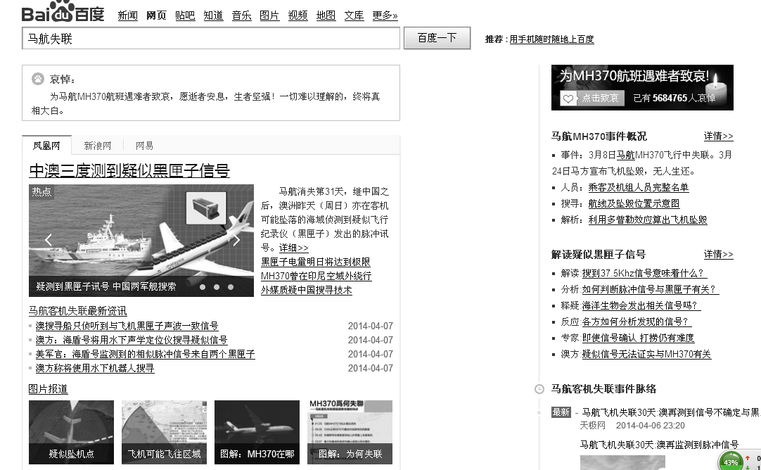 清明節(jié)的小長(zhǎng)假也結(jié)束了,深圳的暴風(fēng)雨也停止了,明星的出軌風(fēng)波也平靜了,唯獨(dú)馬航的失聯(lián)事件還在進(jìn)一步的擴(kuò)展調(diào)查中。百度馬航失聯(lián),百度已經(jīng)將該頁面的搜索結(jié)果調(diào)節(jié)成黑白顏色了。馬航從失聯(lián)到現(xiàn)在已經(jīng)有31天了,關(guān)于馬航失聯(lián)的最終原因都眾說紛紜。第一次聽到有關(guān)于馬航失聯(lián)的新聞,那個(gè)時(shí)候韓國電視劇《來自星星的你》在中國正火爆。男主角一幅會(huì)穿越的身軀讓眾多女“屌”都興奮不已,崇拜不已。很多人在新聞評(píng)論下都說馬航肯定是穿越了。小編也跟著摻合,肯定是穿越了,不然機(jī)上的人肯定想方設(shè)法都會(huì)和地上的人聯(lián)系的。事情過了幾天,馬航官方斷斷續(xù)續(xù)的給出一些不可靠的線索,多國聯(lián)合齊心協(xié)力采取搜救措施,全球人的心都牽在馬航上,大家都寧愿相信是飛機(jī)穿越了。