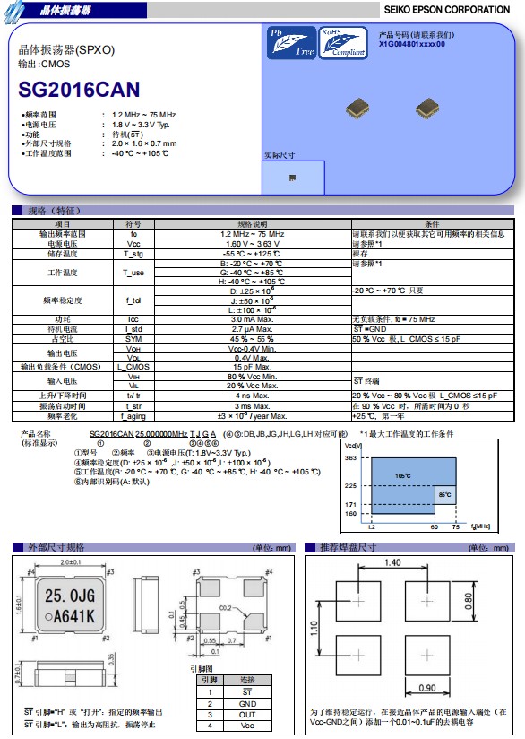 愛普生晶振SG2016CAN,是一款帶CMOS輸出的簡(jiǎn)單封裝晶體振蕩器(SPXO)系列,小體積晶振尺寸2.0x1.6mm,四腳貼片晶振,有源晶振,石英晶體振蕩器,頻率范圍1.2MHz至75MHz,1.8V至3.3V的寬工作電壓和寬工作溫度范圍從-40°C到105°C。這些SPXO具有低電流消耗,高穩(wěn)定性、超小型,輕薄型、低功耗,低抖動(dòng),寬溫等優(yōu)勢(shì)。 這些SPXO非常適合移動(dòng)通訊,智能手機(jī),物聯(lián)網(wǎng)、可穿戴設(shè)備、醫(yī)療、工業(yè)自動(dòng)化等各種應(yīng)用。