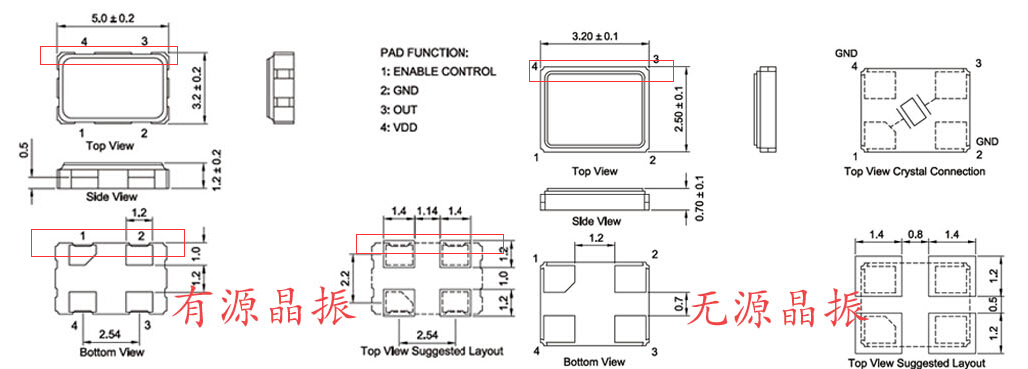 查看大圖可以清楚的看到做出標記的地方是有些區(qū)別的,先看正面,左圖有明顯的凹凸不平,而右圖卻一馬平川,再看下面的腳位圖也是如此.則可以得出這么一個結(jié)論,有源晶振的外觀是有"缺陷"的(凹凸不平的),無源晶振則是一條線,概括一句話就是直.