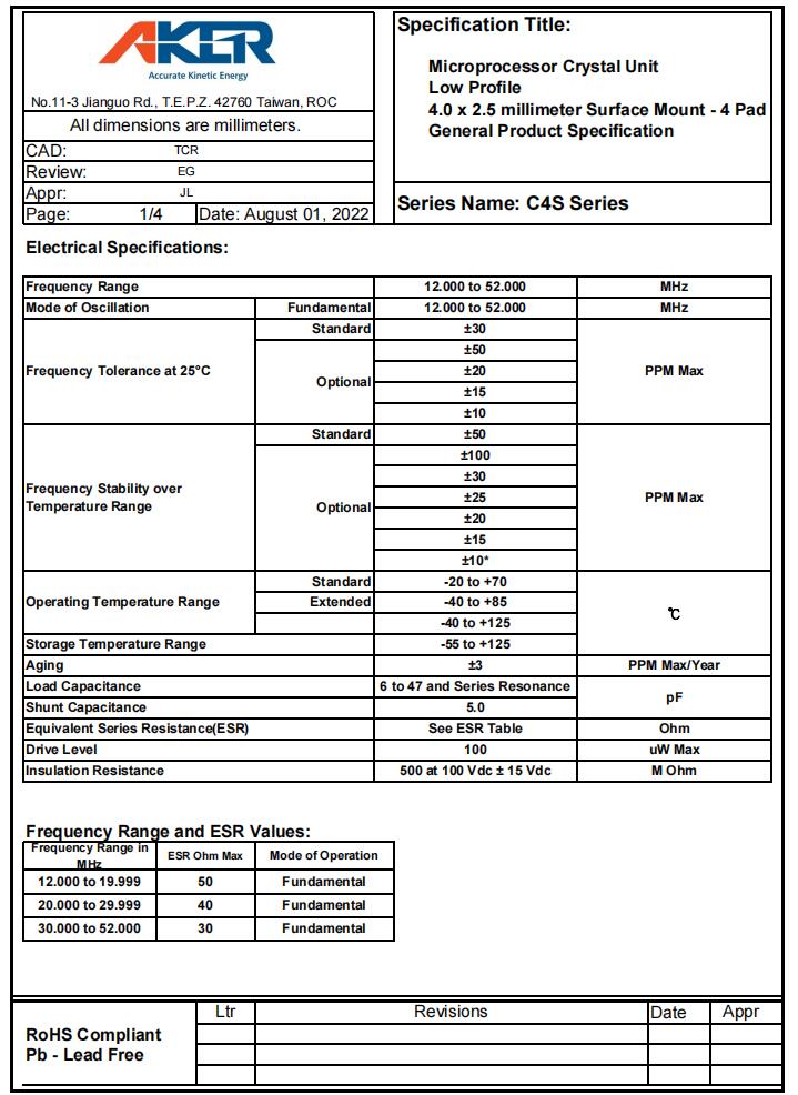 AKER晶振|C4S-16.000-32-1020-X-R|4025mm規格表