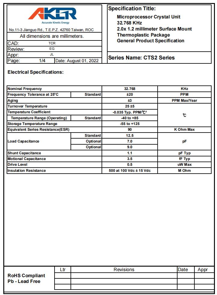 CTS2-32.768-12.5-20-X-R|32.768KHz|12.5pF|AKER晶振規(guī)格表