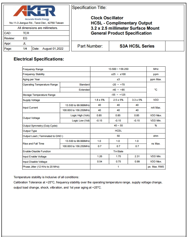 S3A18025-48.000-H-X-R|48MHz|1.8V|AKER安基晶振規格表