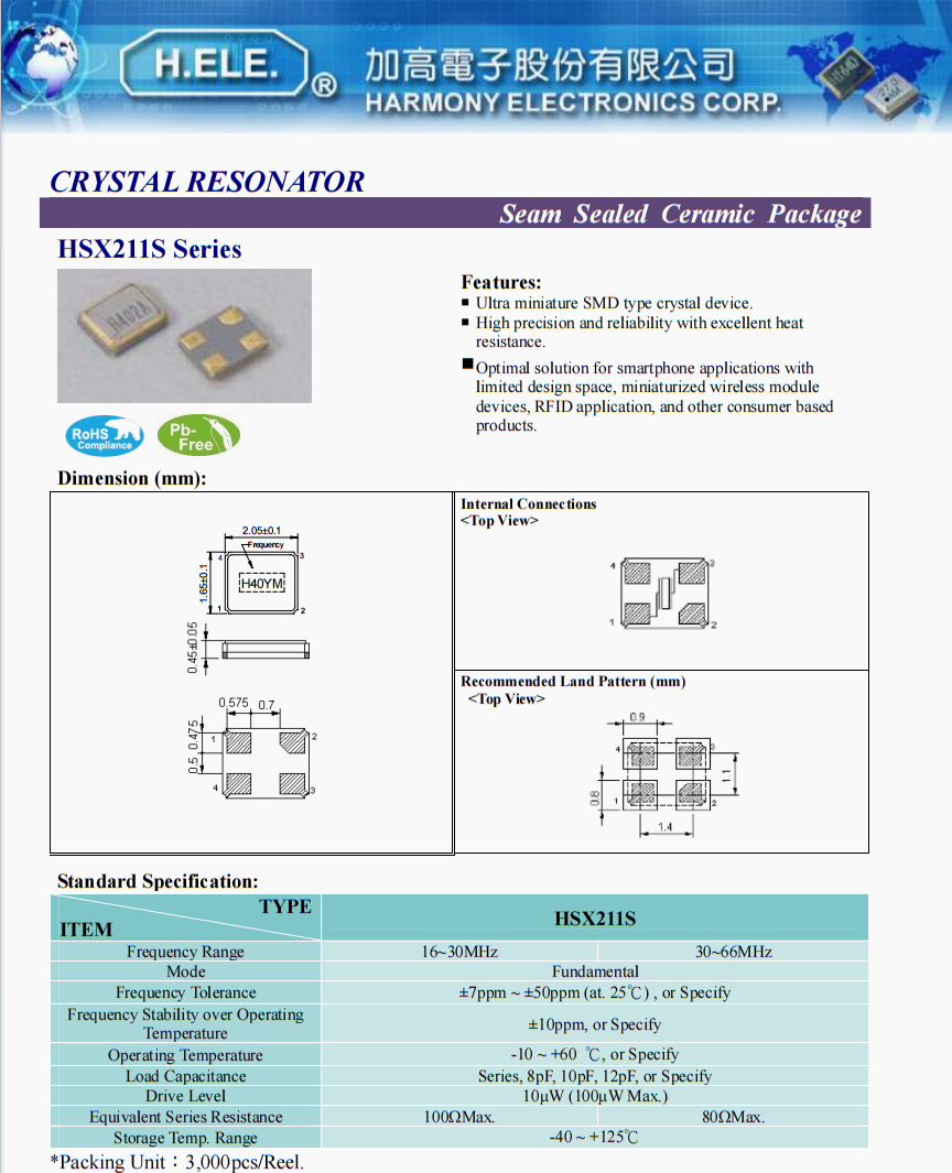 | X2C016000B81H-HPU | 加高晶振 | HSX211S | 16 MHz | ±10ppm | ±20ppm | 8pF | -40°C ~ 85°C |