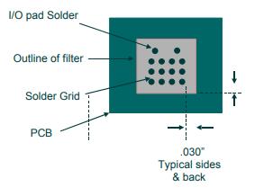 如圖1所示,熔融錫將與金屬化層中的銀結合,耗盡銀金屬化層的厚度,這種情況被稱為“清除”。如果銀清掃嚴重,則可能發生濾波器的操作故障。由于過多的熱量和停留時間,錫的銀清除會加劇。 陶瓷濾波器通常使用焊膏安裝。為了最大限度地減少過濾金屬化中的銀清除,建議使用含銀合金。兩種常見的含銀合金是62Sn/36Pb/2Ag和62Sn/36Pb/1.4Ag。如果需要無鉛焊料,可以使用96.3Sn/3.7Ag共晶焊料。非含銀焊料合金已成功使用。但是,不鼓勵使用它們,并且需要嚴格遵守本文檔中概述的其他焊接指南。銀施加過程使得濾波器邊緣附近的金屬化不像金屬表面中心的金屬化那樣厚。圖2顯示了這種現象的細節。 我們建議為PCB設計焊接掩模和焊接施加方法,以防止焊料接觸聲表面濾波器邊緣。間隙為0.030“是理想的,0.010”是絕對最小值。沒有必要將濾波器的整個底面焊接到地面。這將導致濾波器漂浮在焊料上,由此產生的運動可能導致輸入或輸出短路。通過在濾波器下方的大地面區域中創建網格(或棋盤)抗蝕劑圖案,可以顯著減少這種影響。抗蝕劑網格降低了表面內聚力并防止濾波器浮動,如圖3所示。 焊膏應放置在網格圖案中,接地層為0.004“/0.006”,I/O焊盤為0.006“/0.008”。SAW濾波器可以使用兩種類型的屏蔽中的一種。第一種類型是環繞式盾牌。這種類型的屏蔽不需要焊接到PCB。第二種類型是Ls形屏蔽,應使用.006“-.008”焊料焊珠焊接到位。如果濾波器使用金屬屏蔽,則屏蔽焊珠應為0.006“/0.008”高。差異焊膏厚度是不可能的,建議所有區域使用0.006“焊料厚度。由于陶瓷濾波器是表面貼裝器件,因此在I/O焊盤上涂抹過量焊料以在前表面上形成焊料圓角既不必要也不可取。如前所述,銀金屬化在濾光片的邊緣較薄。在前表面上形成的圓角可能會損害濾光片前邊緣的金屬化。