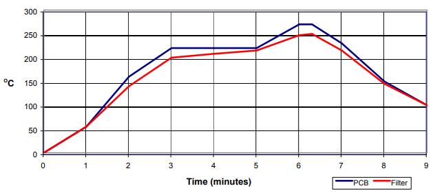 當重新流動金屬化部件時,回流爐提供更大的熱均勻性。但是,在創建和調整烘箱回流曲線時需要小心,以使進口晶振組件不會受到加速銀清除的溫度。當考慮這些濾波器的大熱質量時,這尤其具有挑戰性。執行此過程的最佳技術是將熱電偶連接到濾波器附近,并在濾波器重新流動時運行濾波器的溫度曲線。濾波器主體的溫度不得超過265ºC,并且不得超過240ºC超過45秒。見圖4。 但是對于擁有防護罩的陶瓷濾波器來說,這種高溫是非常重要的.因為構造上所用的屏蔽層可能會在超過270°C的溫度下脫落,在活化溫度以下的浸泡時間有利于補償濾波器的熱質量.在將PCB組成陣列的過程中,應該盡量避免過去翹曲到這焊點斷裂.