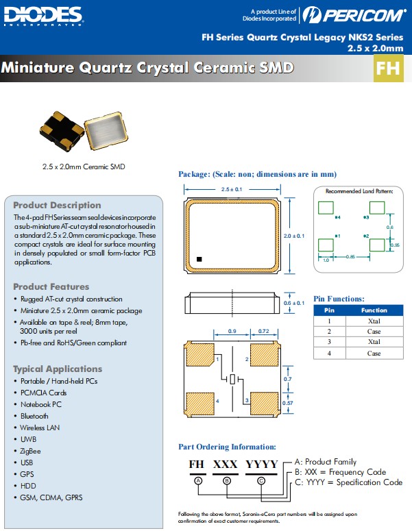 Diodes百利通晶振,FH系列2520mm晶振,FH3200011無源晶振,FH4000047石英晶體,GPS晶振