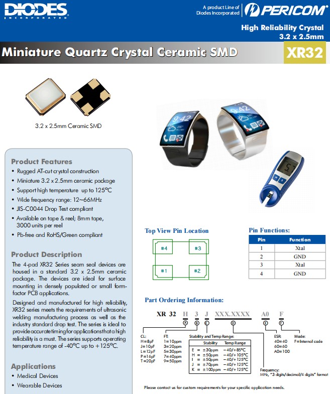 Diodes高性能晶振,XR32安防晶振,XR32H3J20.0000A0F超小型晶振,3225mm晶振,進口晶振,四腳貼片晶振XR32系列接縫密封裝置采用標準的3.2x2.5mm毫米陶瓷封裝。這些器件非常適合密集或小尺寸PCB應用中的表面貼裝。為高可靠性而設計和制造,XR32系列符合超聲波焊接制造工藝以及行業標準跌落測試的要求。XR32系列石英晶體諧振器是為必須具有高可靠性的應用提供精確計時的理想選擇。該系列支持-40℃至+125℃的工作溫度范圍,堅固的AT切割水晶結構 微型3.2x2.5mm毫米陶瓷封裝 支持高達125攝氏度的高溫 寬頻率范圍:12~66MHz,符合JIS-C0044跌落測試,提供磁帶和卷軸;8毫米膠帶,每卷3000個,無鉛且符合RoHS/Green標準,應用于醫療設備,可穿戴設備。